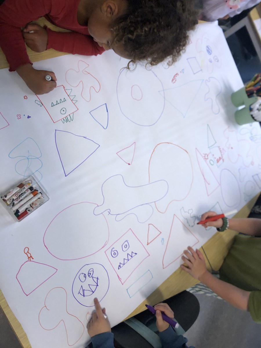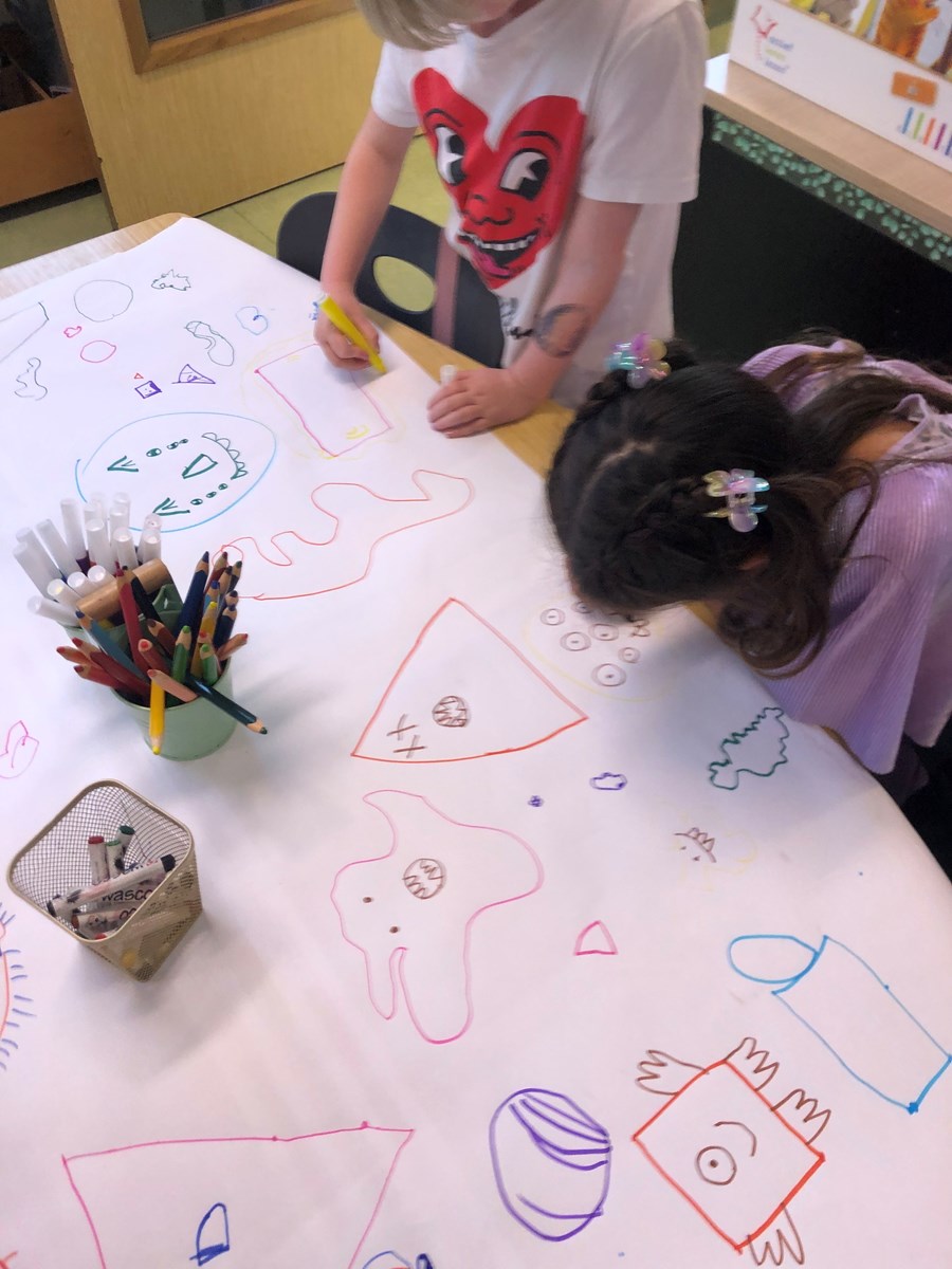 In groepjes werken onze leerlingen samen aan het tekenen van monstertjes op een groot vel papier. Hierbij leren ze niet alleen over geometrische en organische figuren, maar ook over het belang van samenwerken en communiceren. Ze ontdekken hoe ze samen iets moois kunnen creëren!